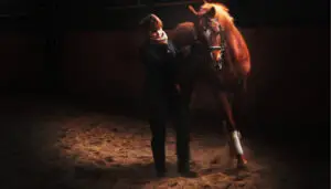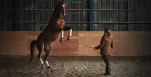 Le cheval étant en liberté, le cavalier communique avec lui par son langagement corporel.