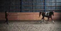 Le cavalier au sol manie de longue rênes permettant de mettre son cheval dans un mouvement ou un autre, sur le cercle, une ligne droite ou les mouvements latéraux.